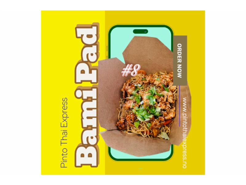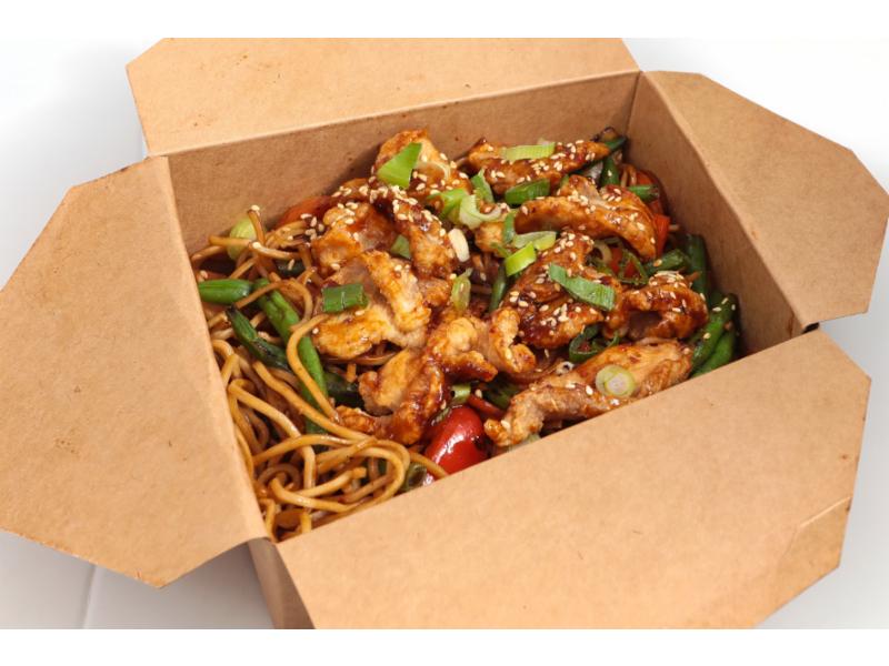 Wok eggnudler og grønnsaker: gulrot, paprika, sjampinjong og bønner. Sprøstekt kylling, vårløk og sesamfrø på toppen